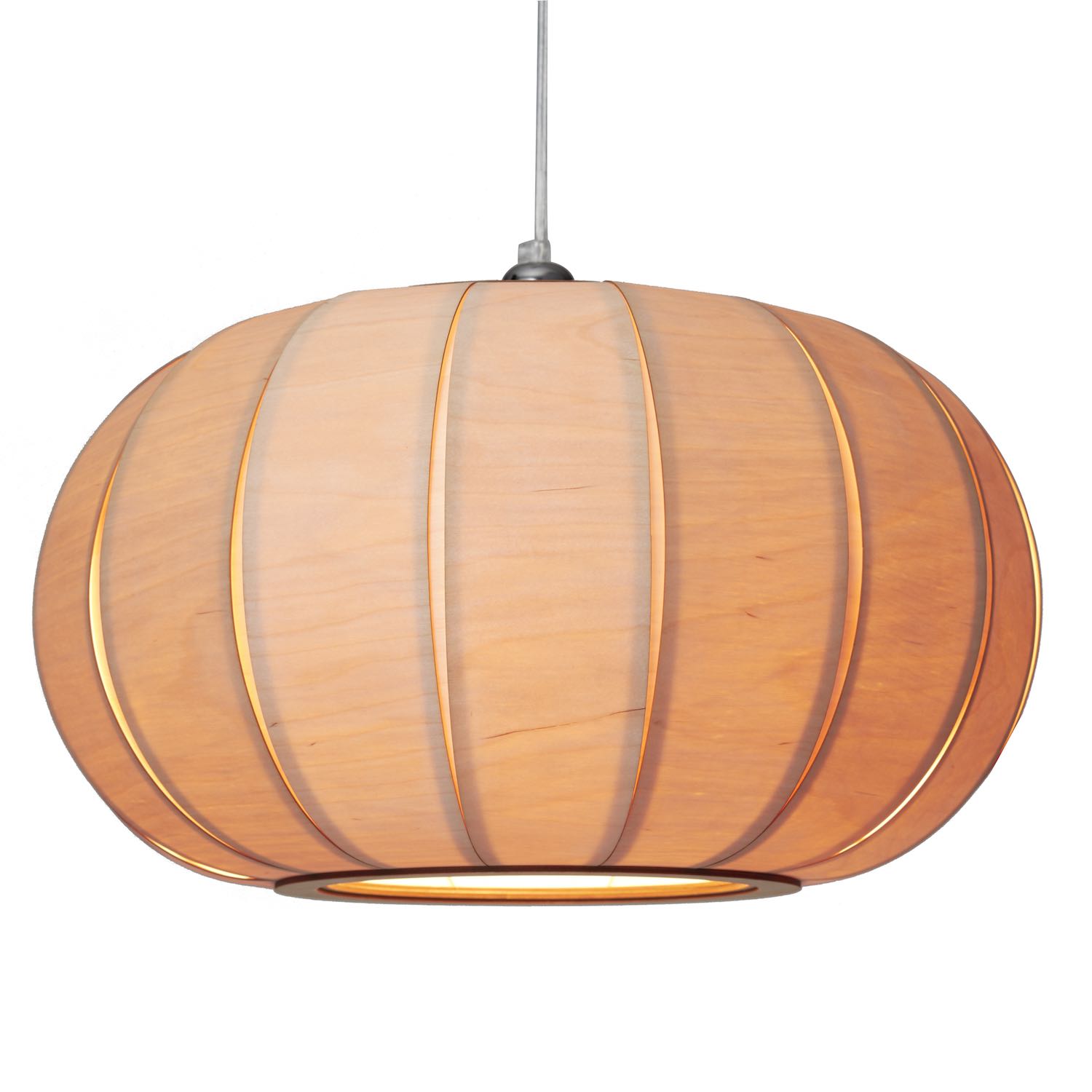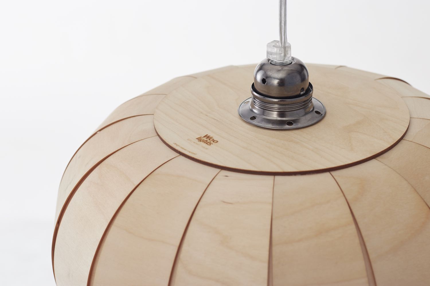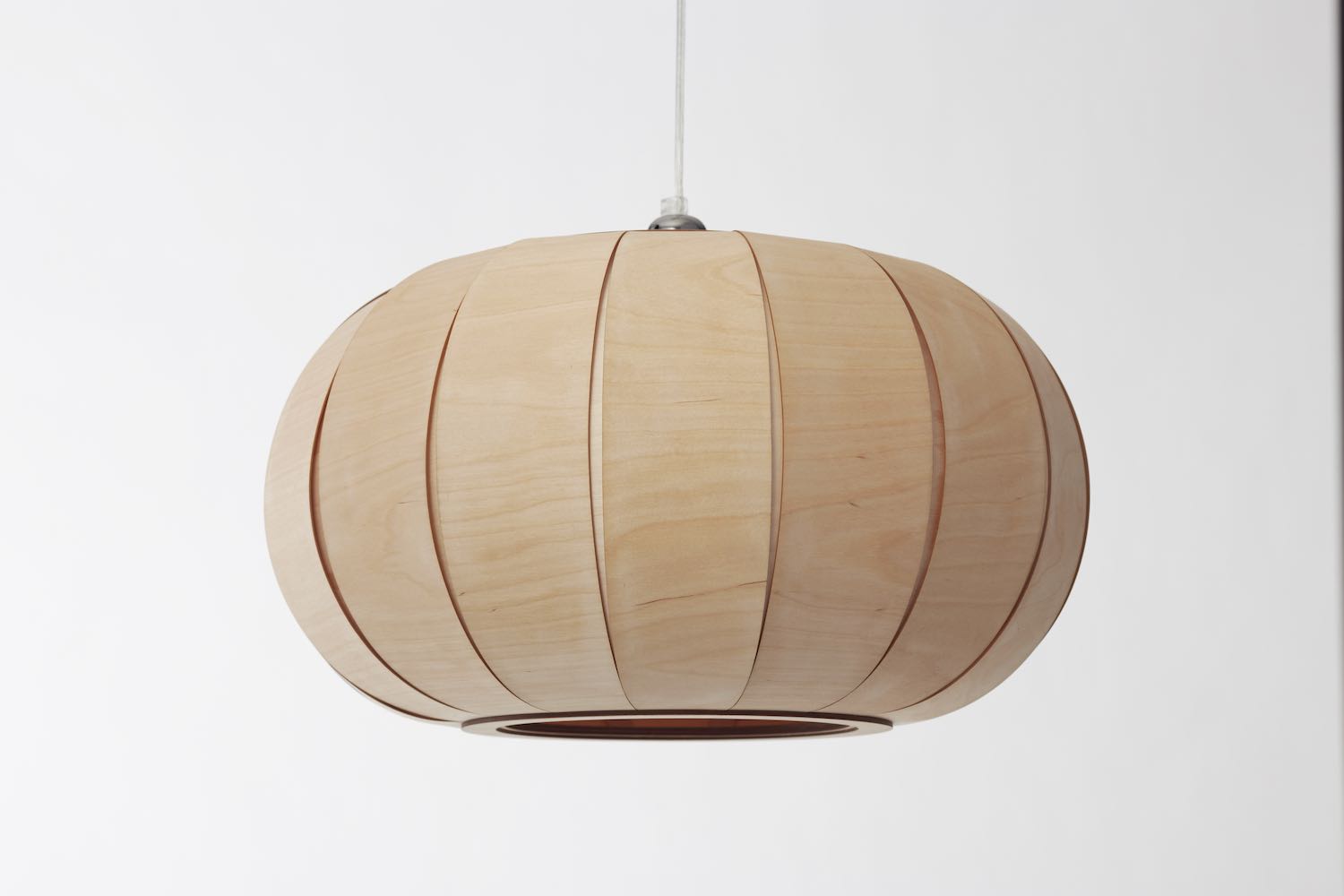 The lamp is made of thin translucent birch stripes. The light closed inside the lamp by wooden petals is diffused and changes colour of the lamp from natural birch wood to orange - yellow, when the light is on. The lamp is opened from the bottom. This hole allows direct light on space beneath the lamp. This is very decorative lamp, ideal as accent light or zone lighting. Perfect to hang above the table in group. Available in two sizes 35 cm and 50 cm in diameter.
