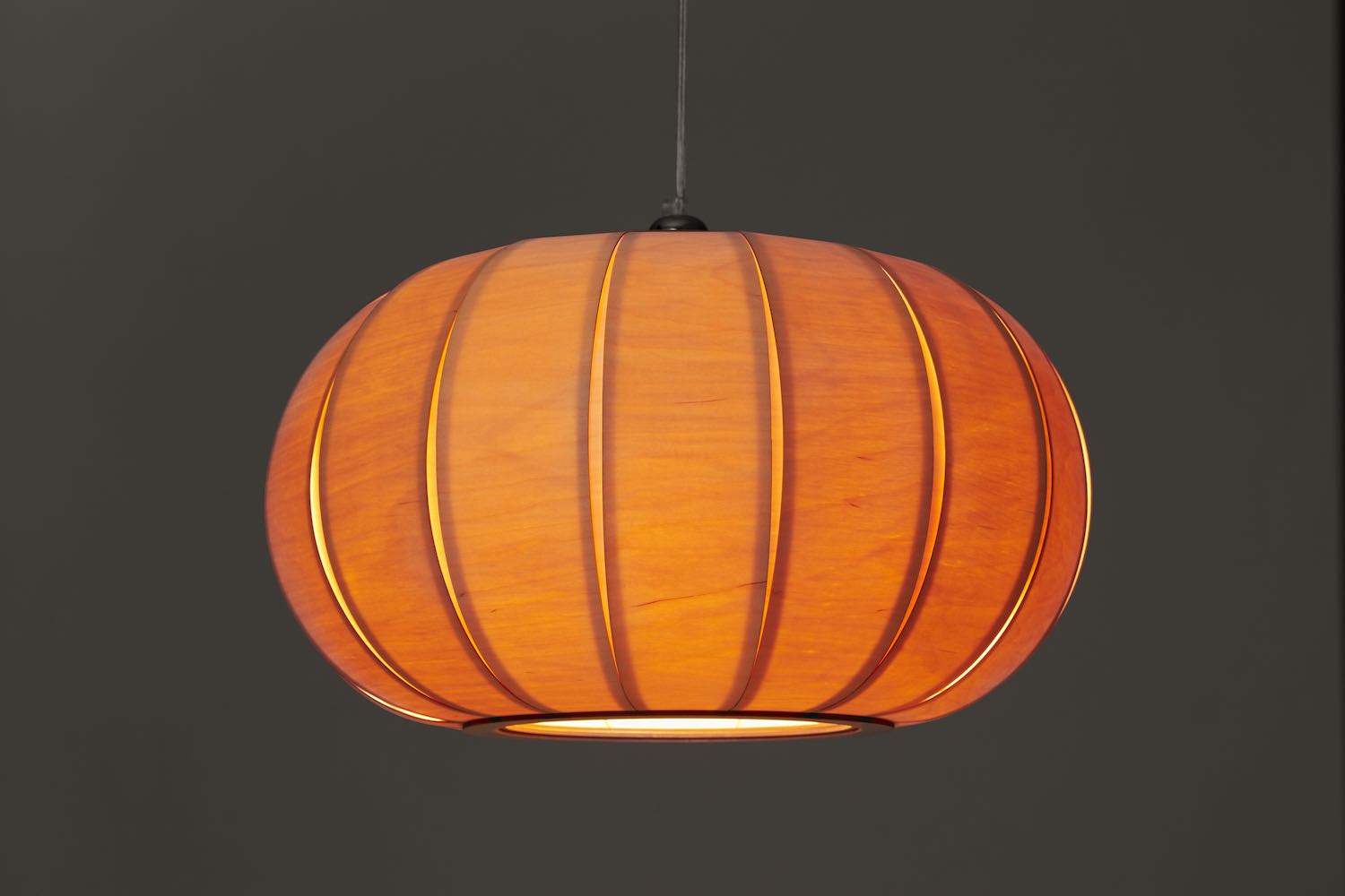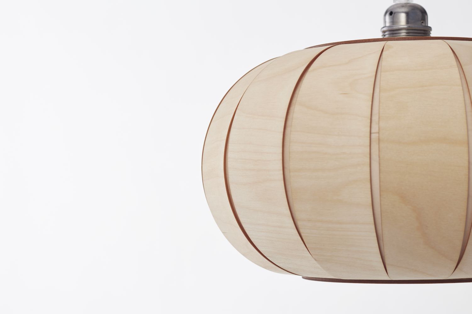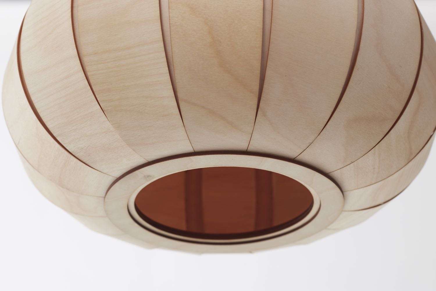 The lamp is made of thin translucent birch stripes. The light closed inside the lamp by wooden petals is diffused and changes colour of the lamp from natural birch wood to orange - yellow, when the light is on. The lamp is opened from the bottom. This hole allows direct light on space beneath the lamp. This is very decorative lamp, ideal as accent light or zone lighting. Perfect to hang above the table in group. Available in two sizes 35 cm and 50 cm in diameter.